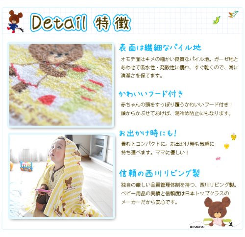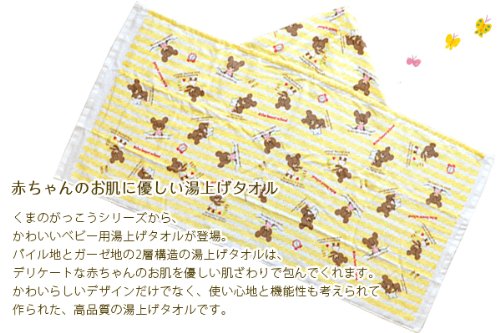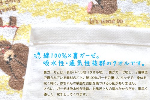 大人気絵本シリーズ、くまのがっこうが寝具になりました! パイル地とガーゼ地の2層構造の湯上げタオルは、デリケートな赤ちゃんのお肌を優しい肌ざわりで包んでくれます。 裏ガーゼとは、表がパイル地(タオル地)、裏がガーゼ地と、2層構造で織られている素材のこと。綿100%ガーゼの優しいタッチで身体を拭く時に、赤ちゃんの敏感なお肌を傷つける心配がありません。さらに、ガーゼは吸水性が抜群。お風呂上りの濡れたからだを、素早く優しく、拭きとってくれます。 かわいらしいデザインだけでなく、使い心地と機能性も考えられて作られた、高品質の湯上げタオルです。