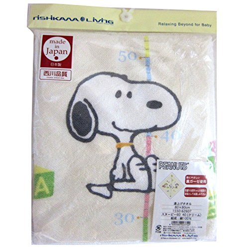 西川リビング、スヌーピーの肌にやさしい裏ガーゼ使用の、湯上げタオルです。 優れた吸水性の正方形バスタオルです。目盛りは赤ちゃんの成長の目安としてお楽しみ下さい。