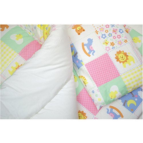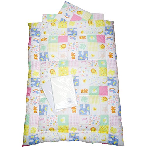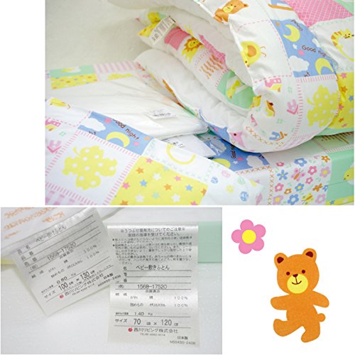 ベビー組ふとんがお買得!かわいい動物たちがいっぱ〜いのセットです。安心の西川品質の日本製です。 パステルカラーのどうぶつやお花がブロックチェックに 並べられたかわいいプリント! 側生地とカバー類は、肌にやさしい綿100% 『うつぶせ寝育児についてのご注意』 1.誤った使用方法による事故を防ぐため、必ず医師の 指導をお受けください。 2.枕は、絶対に使わないでください。 3.シーツは、たるみにくいラップシーツを使ってくだ さい。 4.顔のまわりや手の届くところに鼻や口をふさぐよう なものを置かないでください。 5.別のふとんを重ねないでください。
