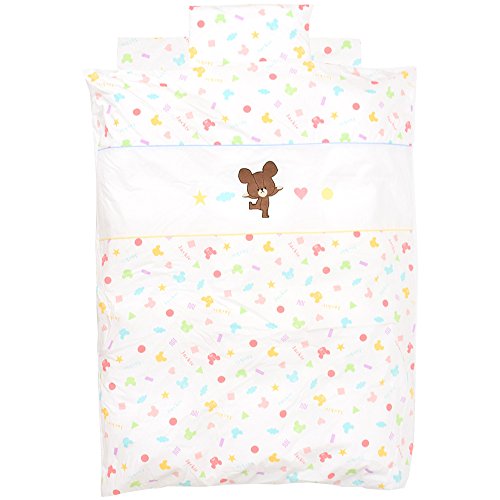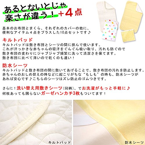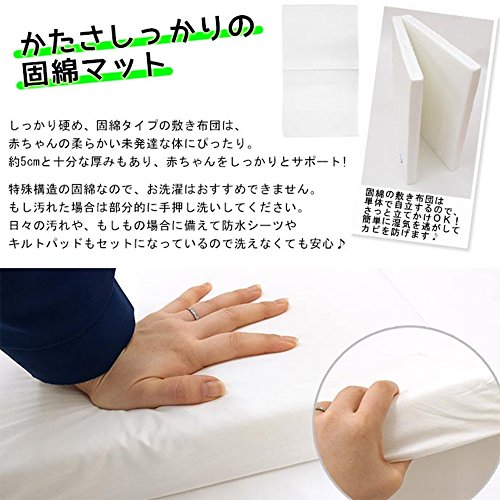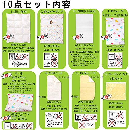 - [本体サイズ] 本体サイズ[掛け布団]約95×120cm[掛けカバーリング]約102×128cm[固綿敷き布団]約70×120×5cm[敷き布団用シーツ]約70×120cm(1枚あたり)[まくら]約27×37cm[ピロケース]約27×37cm[キルトパッド]約70×120cm[防水シーツ]約70×120cm[ガーゼハンカチ]約25×25cm(1枚あたり)