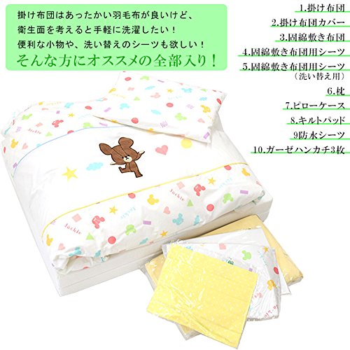 - [素材] [掛け布団]生地:ポリエステル75%、綿25% 詰物:ピュアホワイトダウン85%、フェザー15%[掛けカバーリング]綿100%[固綿敷き布団]生地:綿100% 詰物:ポリエステル100%、1.8kg[敷き布団用シーツ]綿100%[まくら]生地:綿100% 詰物:ポリエステル100%、0.03kg[ピロケース]綿100%[キルトパッド]生地:綿100% 詰物:ポリエステル100%[防水シーツ]パイル:綿100% 地糸:ポリエステル100% 裏面:ポリウレタン使用[ガーゼハンカチ]綿100%
