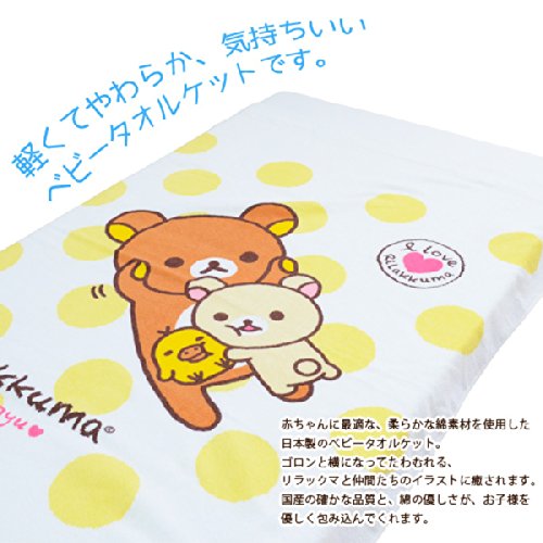 - 赤ちゃんに最適な、柔らかな綿素材を使用した日本製のベビータオルケット。 ゴロンと横になってたわむれる、リラックマと仲間たちのイラストに癒されます。 国産の確かな品質と、綿の優しさが、お子様を優しく包み込んでくれます。 優れた吸湿、吸汗性と、発散性を持つ綿100%生地だから、ムレにくく、新陳代謝が活発で汗っかきなお子様でも安心。 ベビー布団にもピッタリですし、夏場のお昼寝時のクーラー冷え防止のためにお腹にかけてあげたり、ベビーカーや車用のケットとしても最適。一年を通して、いろいろな場面で活躍してくれます。