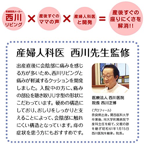 産後すぐのママの声を参考に、産婦人科医の西川正博先生と老舗寝具メーカー・西川リビング(大阪西川)が開発したリバーシブル・クッションです。 U字型が座る時にデリケートゾーンに触れにくい。産後すぐの痛みを軽減します。 側生地には汚れを拭き取りやすくするウレタンコーティング加工を施して、つるっとなめらかな肌触りに仕上げました。 ご注意 ※掲載画像の色合いは実際の商品に近づけておりますが、撮影状況やモニターの設定などの違いにより、実際の色合いと多少異なる場合がございますのであらかじめご了承ください。