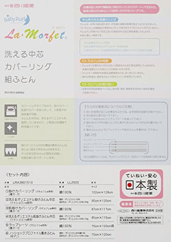 - [本体サイズ] 掛けカバーリング:102×128cm 洗えるポリエステル掛け中芯(ウォシュロン®):95×120cm 肌掛けカバーリング:87×117cm 洗えるポリエステル肌掛け中芯(ウォシュロン®)85×115cm ラップシーツ:70×120cm ノンショックプロファイル敷きふとん:70×120×5cm
