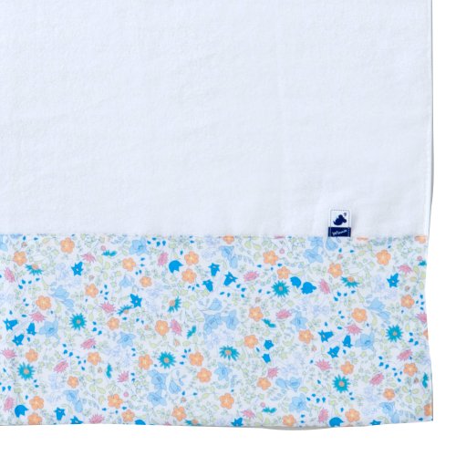 [商品説明]小花柄と、一瞬どこにいるか分からないほどさりげないミニーちゃんのモチーフがミックスされたちょっと大人カワイイ雰囲気のテキスタイルを使用。白地に華やかな色合いが目をひくイラストタッチ柄が新登場です。タオル生地にはやわらかな無撚糸を使用しています。キャラクターが苦手なママにも高級感があり、ギフトにも最適です。