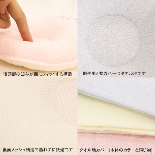 まだ、頭部がやわらかい 赤ちゃんの為の枕です。 仰向けや横向き寝に対応 頭の形を整えます。 表面はタオル地なので、 寝汗を吸収します。 裏面はメッシュ構造なので 通気性に優れて蒸れにくく 赤ちゃんに最適です。 パイプとわたが詰め物で 適度なクッション性と やわらかさでやさしく、 赤ちゃんの頭部を支えます