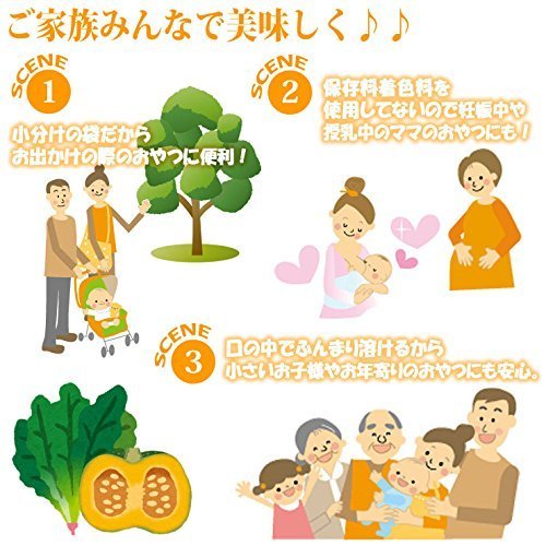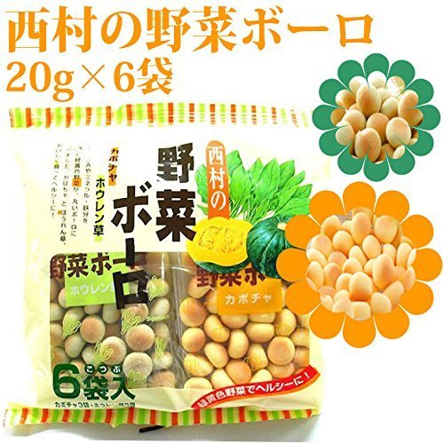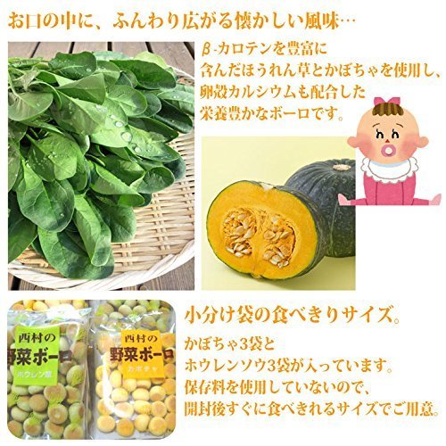 20g×6袋(かぼちゃ3袋+ホウレンソウ3袋) 「西村の野菜ボーロ」は、β-カロテンを豊富に含んだほうれん草とかぼちゃを使用し、卵殻カルシウムも配合した栄養豊かなボーロです。かぼちゃとほうれん草、おいしく食べてヘルシーに!