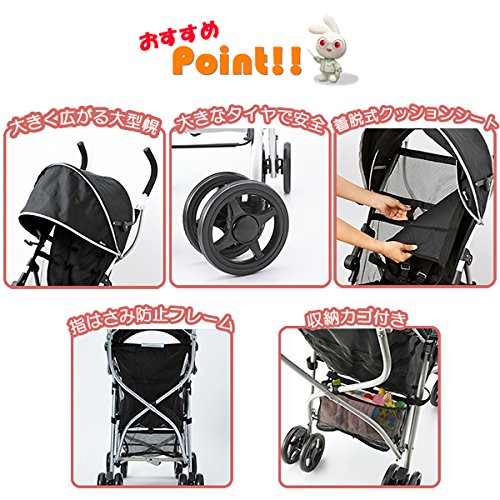 - 36ヶ月まで使えるゆったりサイズ、 大きく広がる大型幌 、アルミフレーム採用の超軽量本体、大きなタイヤで安全走行、着脱式クッションシート 、西松屋オリジナルの指はさみ防止安全フレーム 、買い物かご付き(最大積載荷重5kgまで) ※開閉可能(自立しません)