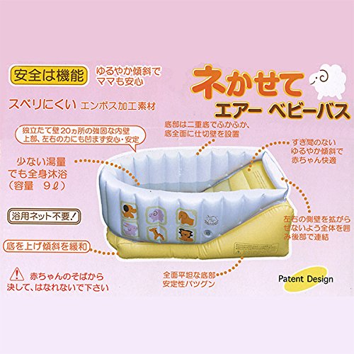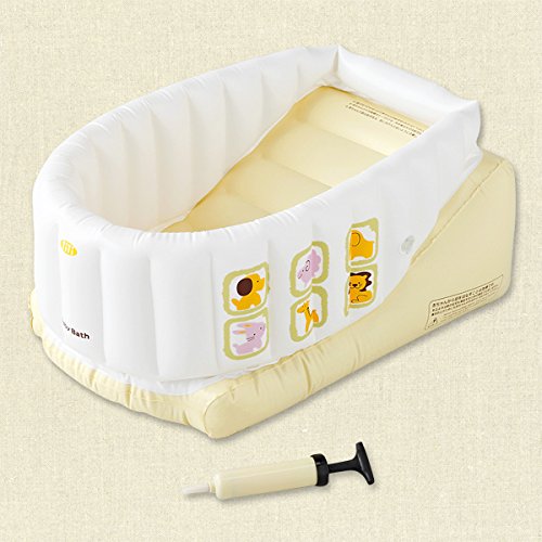 【適応月齢】0~6ヶ月頃|【容量】9L(Maxラインまで)|【素材】本体、パーツ:塩化ビニール(非フタル酸系)|【サイズ(外寸)】65(L)×41(W)×30(H)cm(空気を入れたサイズ)|エアーポンプ付で空気入れがかんたん!|独立タテ壁構造により、頑丈でウデが沈まない。|ゆるやか傾斜で浴用ネット不要。|空気検査済み。|中国製