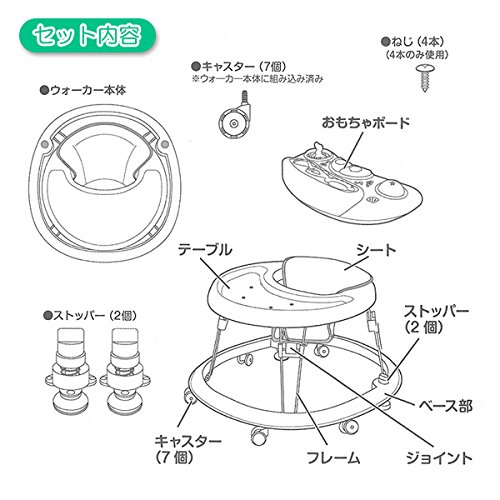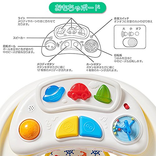 【対象月齢】7ヶ月~15ヶ月|【適応体重】12kgまで|【サイズ】約 61.5×65×42cm(折りたたみ時高さ:約 13cm)|【重量】3.0kg|【材質】本体・おもちゃボード:スチール・PP・PC・ABS・TPR|シート:ポリエステル・PP・PUR|【オススメポイント】楽しいメロディとライトが光るおもちゃボード|本体の動きを制止できるストッパー|組み立てや折り畳みがしやすいカンタン構造!|赤ちゃんのおしりにやさしい、ふんわりソフトシート♪|フローリングでも静かな消音キャスター採用|※単3電池2本使用(別売)|中国製