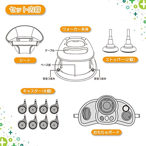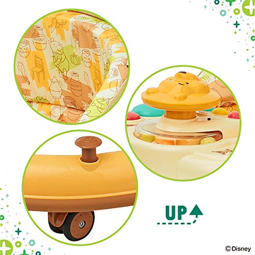【対象月齢】7ヶ月~15ヶ月|【適応体重】12kgまで|【サイズ(cm)】約 幅65×奥行71×最大高さ57cm|※折り畳み時高さ:31cm|【重量】4.3kg|【主な材質】本体:スチール・PP・ABS・TPR|おもちゃボード:PP・ABS・PC|シート:ポリエステル・ポリウレタン・PP|【オススメポイント】お子さまをしっかりガードする安全ベルト付き。|歩行器の動きをしっかり固定する大型ストッパー。|楽しい音楽を奏でるおもちゃボード。|(オンオフスイッチ、12曲のメロディ、プーハンドル、ステッカー)|おもちゃボードを取り外せば、テーブルに!・お子さまの成長に合わせて高さを5段階に調整可能!|消音キャスター|※単3アルカリ電池2本使用(別売)|中国製