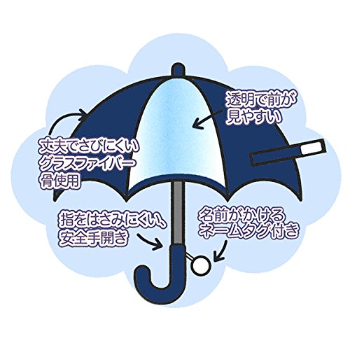 【親骨の長さ】40cm|【対応身長】95-105cm|【生地の組成】ポリエステル100%(透明部分:ポリエチレン)|丈夫でさびにくいグラスファイバー骨使用。|指をはさみにくい安全手開き。|透明で前が見やすい。|名前がかけるネームタグ付き。|中国製