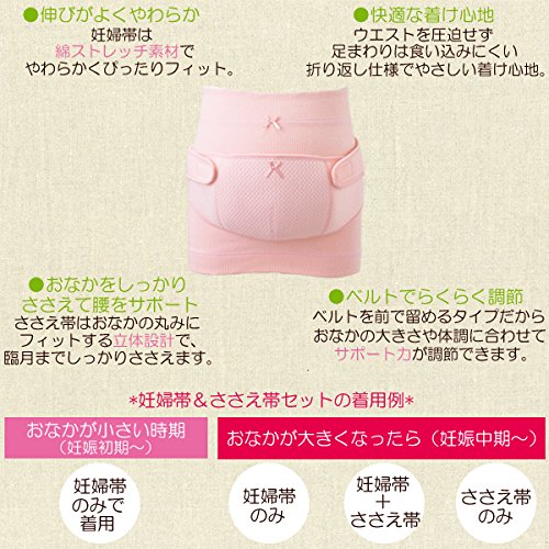 ■産前用■|【サイズ(cm)腹囲/ヒップ】M-L: 78-110 / 87-105|【素材】妊婦帯:綿97%・ナイロン2%・ポリウレタン1%|ささえ帯:ポリエステル・綿|伸びがよくやわらか|おなかをしっかりささえて腰をサポート|快適な着け心地|ベルトでらくらく調節|中国製