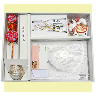 ● セット内容 扇子 お守り袋 でんでん太鼓 いぬ張子 誕生記 フード 前掛け のし袋 *お参りの際は、子供に新調した着物やベビー服を着せ、頭巾やフード、よだれ掛けなどをつけ、用意したお祝い着を掛着として着用します。 (お祝い着を掛けるときは、絵柄がよく見えるように広げ、抱いた子供の体を覆うように掛け、祝い着の付紐の一方を肩側から、他方を脇から通して、抱き手の方の背で蝶結びにします。) ● 日本製