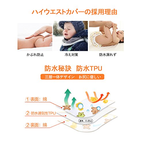 【ハイウエストの立体裁断】:伸縮性がある10*10cmのハイウエスト仕様で赤ちゃんの体型に合わせて、横モレを防ぎます。