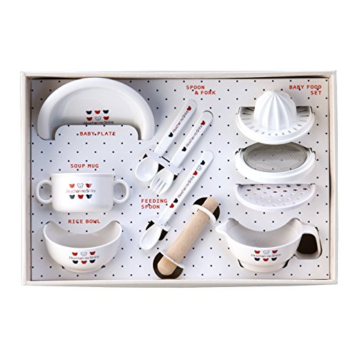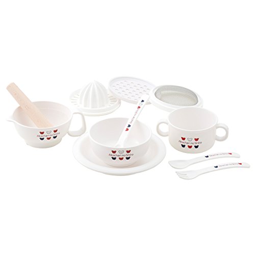 - 赤ちゃん用食器と離乳食調理セットです。お皿やスプーン、両手コップなど毎日使える食器に加え、すり鉢やおろし器、こし網などの便利な調理グッズが11点揃っています。おろし器以外は電子レンジ・食洗機にもお使いいただけます。シンプルな白い食器にくまさん柄が可愛い、男女問わず人気のデザインです。
