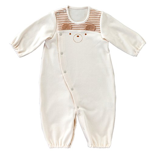 - 胸元に大きなくまさんの顔の刺繍と立体的な耳が付いている、シンプルなのに可愛いドレスです。保温性にすぐれ、冬だけでなく肌寒い春秋にも適したスムース素材です。やわらかなオーガニックコットンは肌への刺激が少なく、赤ちゃんのデリケートな肌にもやさしい素材です。生まれてすぐはすっぽり足を包むドレスタイプ。足がばたばたできるようになったらボタンを留め替えてカバーオールタイプにもなるツーウェイ仕様です。