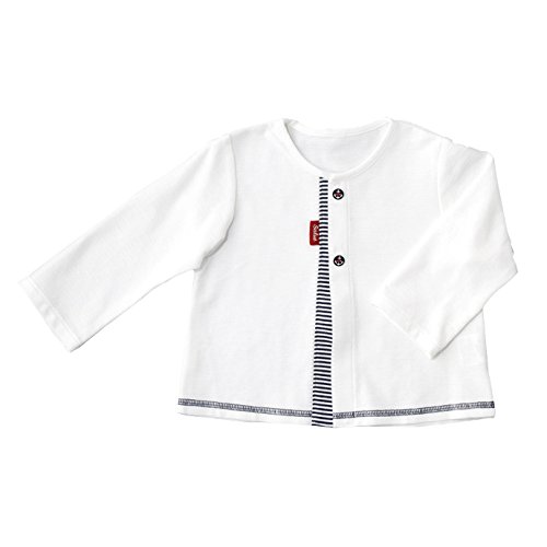 夏を感じさせる白×紺のボーダーと、イカリ柄のボタンがアクセントになったカーディガンです。ボーダーの様な折り柄のある涼しげな生地に、デリケートな赤ちゃんの肌を紫外線から守るUVカット加工を施しています。 手軽に羽織れるカーディガンは、お外遊びやお出かけにぴったりのアイテムです。