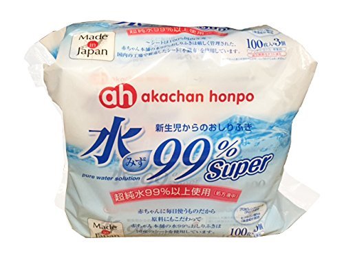 水99%おしりふきスタンダードタイプ!3個パック 化粧品の技術で、新生児から使えるアカチャンホンポオリジナルのおりしふきをつくりました! おしりふきは水に近づけることがいちばんという発想から、徹底的に水にこだわり、超純水※を99%以上使用しています。 残り1%の成分も厳選し、さらに水の品質にこだわりました。 防腐剤・殺菌剤を必要最小限(0.3%以下)に抑えた赤ちゃんのおしりふきです。 プロピレングリコール(PG)は配合していません。 お肌を健やかに保つヒアルロン酸Na(保湿成分)を配合しています。 ノンアルコール、無香料、お肌にやさしい弱酸性です。 乳幼児のおしりふき、身体ふき用。手、足の汚れふきに使えます。 ※超純水:あらゆる技術を駆使し限りなく不純物を取り除いた、純度100%の理論上のH2Oに限りなく近い水のこと ●100枚×3個パック ●シートサイズ:200mm×140mm ●成分:水、ヒアルロン酸Na、乳酸Na、PCA-Na、PEG-60水添ヒマシ油、メチルパラベン、エチルパラベン、セチルピリジニウムクロリド ★このおしりふきは、クイックウォーマー(別売り)をご使用頂けます。