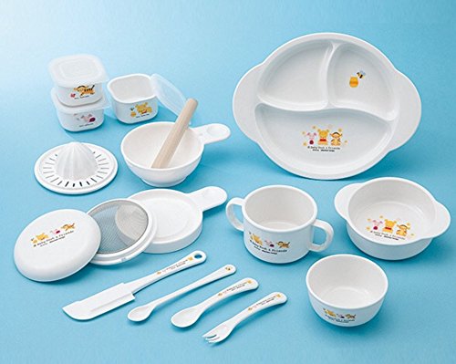 - セット内容:ランチ皿・小鉢皿・飯椀・両手マグ・フォーク・スプーン・フィーディングスプーン・調理ベラ・フリーザーケース3個・フタ・こし器・おろし器・しぼり器・すり鉢・すり棒