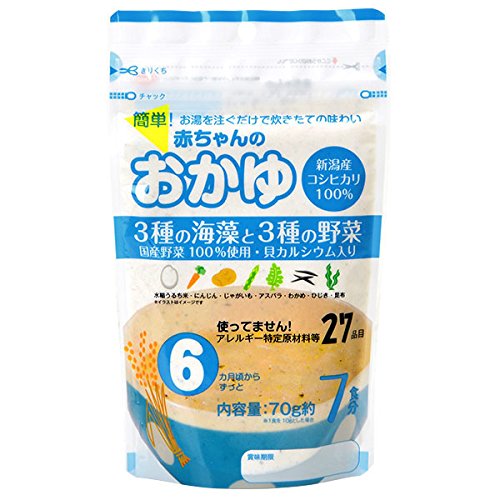 7ヵ月~ 簡単、お湯を注ぐだけで炊きたての味わい新潟産コシヒカリ100%、国産野菜100%使用、貝カルシウム入り。 アレルギー特定原材料等27品目不使用。 お湯を加えるだけで、簡単にやわらかなおかゆができあがります。 お湯の量を調節することによって、月齢に適したおかゆが作れます