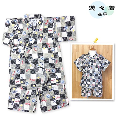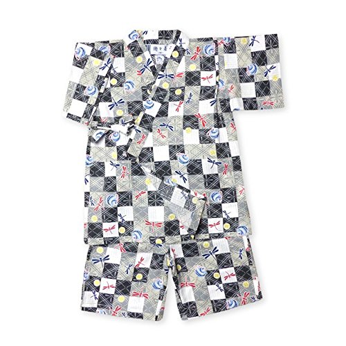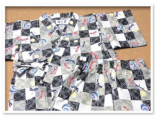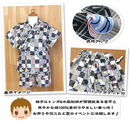 (ブラック/95cm) ベビー服 男の子 甚平 綿100% 格子 トンボ柄 ポケット付 上下組セット 男児 ベビー