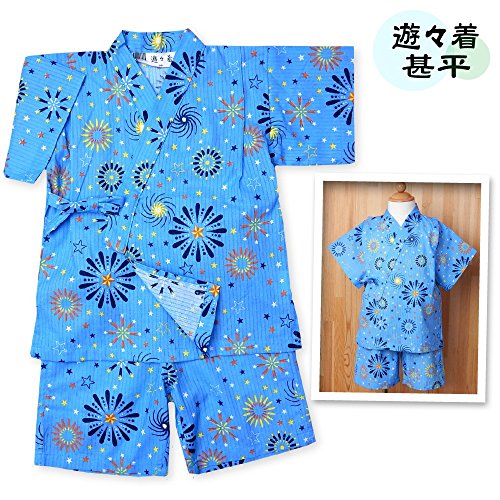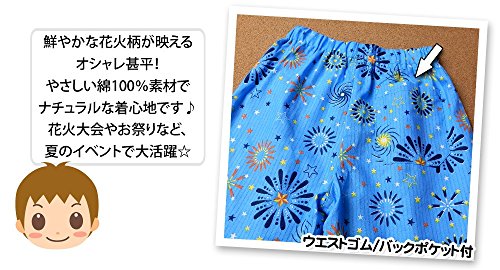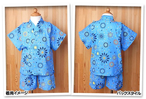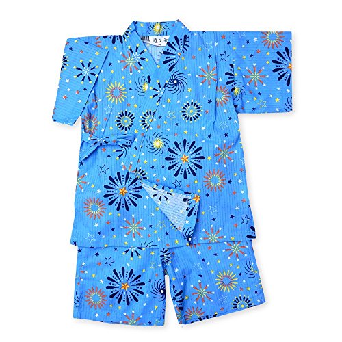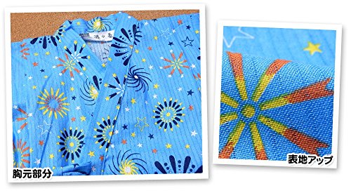 (サックス/90cm) ベビー服 男の子 甚平 綿100% 花火柄 上下組セット 男児 ベビー