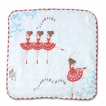 赤いレッスンバーが印象的!人気デザイナーShinzi Katohの描いた可愛いバレエイラストのタオルチーフです。 おもてはガーゼ、裏はタオル地でとても肌触りが良く、吸湿性に優れたタオルです。 ハンカチサイズでバッグに入れてもかさばりません。発表会の記念品やプレゼントにも最適です!