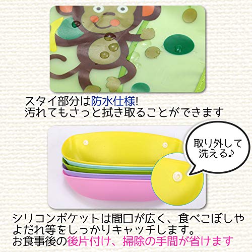- シリコンポケットは間口が広く、食べこぼしやよだれ等をしっかりキャッチします。お食事後の後片付け、掃除の手間が省けます。