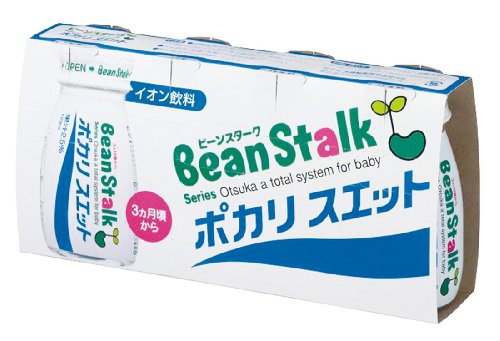 「ビーンスターク 赤ちゃんのためのポカリスエット 120ml×4本」は、発汗により失う水分やイオン(電解質)を、スムーズに補給できるイオン飲料(ベビー)です。赤ちゃんの体に素早く吸収されます。たくさん汗をかいた時の水分補給に最適。お出かけ、お散歩、お風呂の後や発熱時などにオススメです。飲みきりサイズの120mlで衛生的。ボトルにニプルも付けられます。3ヵ月頃からの赤ちゃんに。
