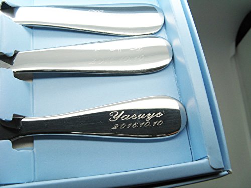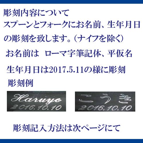 - 名入れはスプーンとフォークに名前、生年月日の彫刻(ナイフは除く)携帯番号記載の場合SMSにて連絡出来ますので早くお届け出来ます。