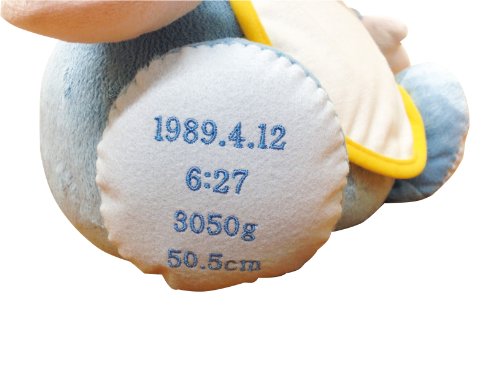 - 【刺しゅう内容:右足】「生年月日」、「誕生時刻」、「体重」、「身長」