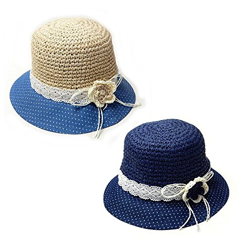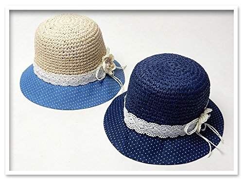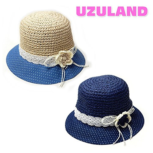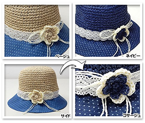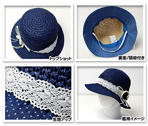 (ネイビー/50cm) 子供 ペーパーハット 麦わら帽子 女の子 UZULAND ウズランド レースリボン コサージュ付 ドット切替 女児 ベビー キッズ