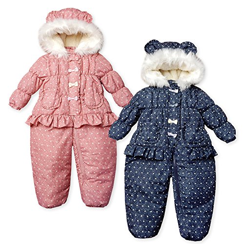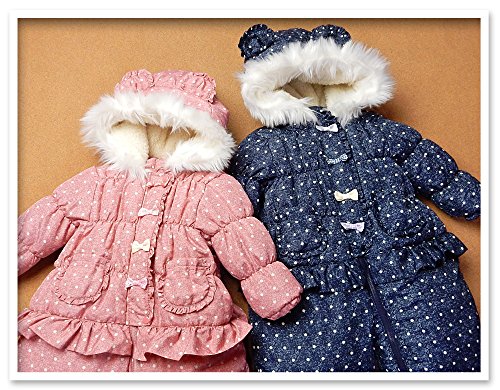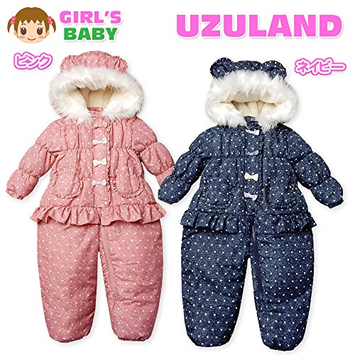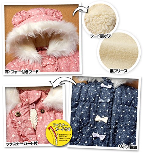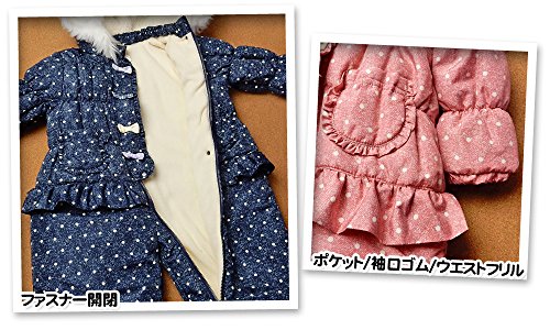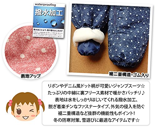 (ネイビー/95cm)ベビー服 女の子 カバーオール ジャンプスーツ UZULAND ウズランド 中綿 裏フリース 撥水加工 前開きファスナー デニム風ドット柄 リボン フリル クマ耳付き ファー付きフード 女児 ベビー