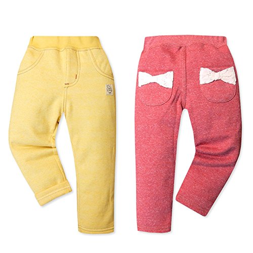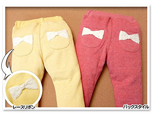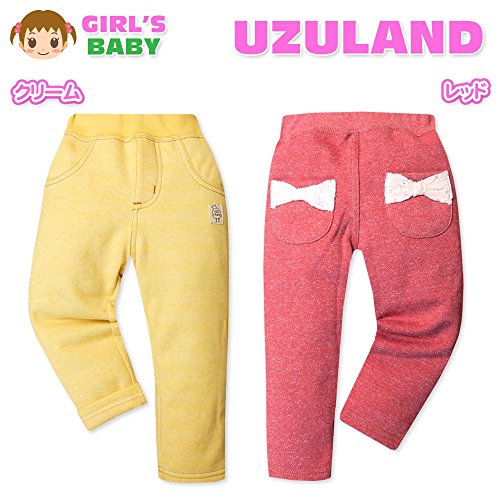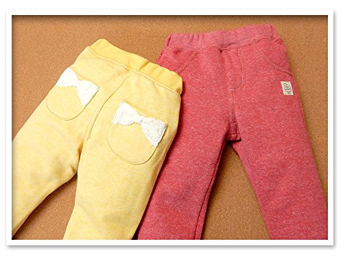 (レッド/90cm)ベビー服 女の子 ロング パンツ ボトム 裏起毛 ワッペン レースリボン付ポケット ウエストゴム 女児 ベビー