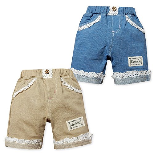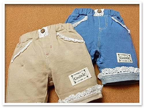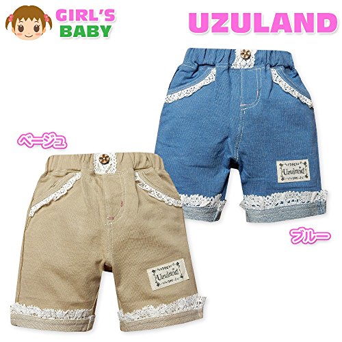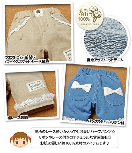 (ブルー/90cm)ベビー服 女の子 ハーフ パンツ UZULAND ボトム 綿100% ニットデニム レース装飾 リボン ウエストゴム 女児 ベビー