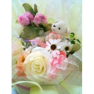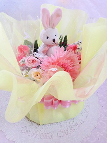 ピンクのローズブッシュを中心に豪華なお花をアレンジしています。真ん中にはクマまたはウサギのマスコット(チェーン付)が座っています。不織布て包み込みリボンはサテンリボンとレース風リボンを2重にしています。最終ラッピングは透明セロファンで全体を包みカールリボンで可愛くラッピングしてお送りします。