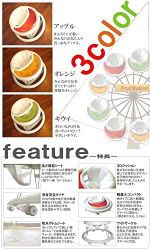 沢山の方に愛され続けている丸型ウォーカー(歩行器) シンプルだけど丸型ウォーカーには沢山の魅力があります! けど、お洒落でかわいいのがない・・・ そんなパパママの声から生まれたフルーツウォーカーは 先輩パパママの声を商品にした満足度◎♪レビュー高評価のベビーウォーカーです。 ★フルーツウォーカーのおすすめポイント♪ その1、家事、離乳食時など、お子様が動いて欲しくない時に便利な防水ストッパーシート付き その2、ちょっとした小物やおむつ、おしりふきなどを入れられるウォーカーポーチ付き その3、テーブルが汚れても安心♪かわいいフルーツ柄のランチョンマットは外して洗えます その4、お子様の成長に合わせて高さ調整できるシート その5、汚れても簡単ふき取るだけの防水性の高い安心シートでいつも清潔 その6、丸型で超軽量な設計はお子様の歩行をやさしくサポートしてくれます その7、コンパクトに折りたためるので収納、持ち運びもとっても便利 その8、フローリングやマンションなどでの使用も安心の消音ソフトタイヤ(巻込み防止機能付)