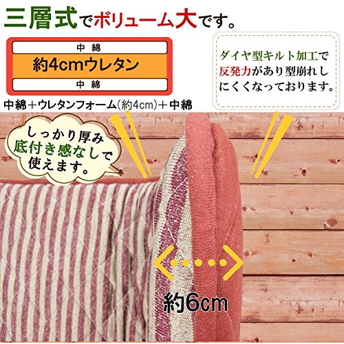- ★ 三層式 ★中綿+ウレタンフォーム(約4cm)+中綿の3層式でダイヤ型キルト加工をしておりますので反発力があり型崩れしにくくなっております。ほどよい厚みです。長座布団 としても使えます。★表生地は,やわらかタッチの 先染め生地 ポリエステル素材です。★ ・肌にまとわりつかずサラっとした気持ちいい肌触りです.先染め生地は 糸を染めてから織りあげますので、生地に奥行 と長持ちするのが特徴です。★ サイドにハイピング付きで、サイドの縫い目の耐久性がアップします。★ 裏生地はトリコット(ポリエステル100%)です。