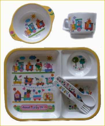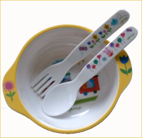 ジル マクドナルドの描く可愛い食器セットが出来ました。 お食事が始まったら、こんな可愛い食器セットで 皆と一緒にお食事だ。 赤ちゃんのことを考えて、使いやすく安全に仕上げたセットですので、安心してお使いください。 大き目のプレートとマグカップとボウルとスプーンフォークの5点セットです。 どのアイテムもよく使われる代表的な形の食器です。 今人気のシリーズですよ。夢とメルヘンにあふれる食器でお食事をしていれば 何かとっても豊かな気分になれて、赤ちゃんも大喜びでお食事をするのではないでしょうか? 仕切りプレート=20cmx26cmのプレートで色んな食べ物を区分けして、並べられます。 混ざらないように、仕切りの高さをしっかりと作っていますので、混ざりにくいです ボウル=直径12cmで持ちやすい形状となっています。 底の形状も安定するように考慮されてます。 マグ=直径8cmで一番使いやすいタイプとなっています スプーン、フオーク=持ちやすい、握りやすい太さで仕上げています。 以上5点セットです 素材=ポリプロピレン 取り扱い方法は在中の説明書をご参考にしてください