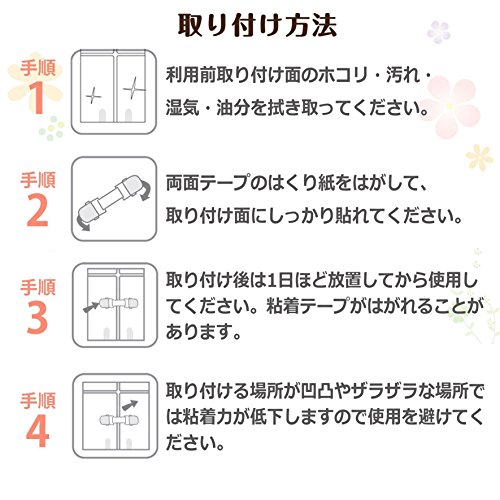 - 【材質】:プラスチック (粘着テープで簡単に取り付けできます。のり残りしにくい特殊な粘着テープを使用しています。)