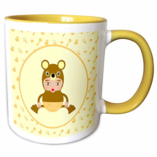 3drose Belinha Fernandes – Babies and Sweetバグ – Sweet Baby Dressed In A Bear Costume Illustration , With Rubber Duck、おしゃぶりand Rattle – マグカップ 11-oz Two-Tone Yellow Mug mug_160601_8