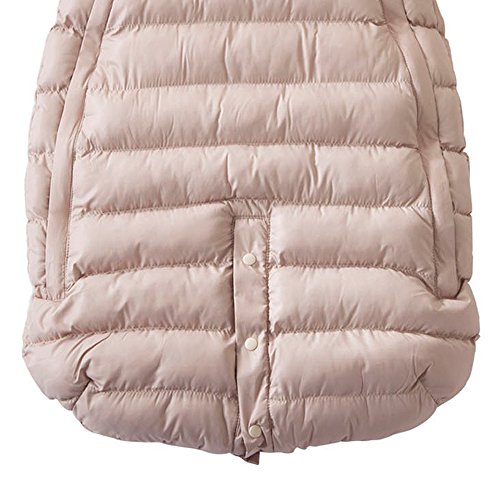 Integrated hand covers on sleeves and comfy hood with faux fur trim;Two side zippers that span the length of the bunting;Lightweight;windproof & water-repellent outer shell and faux down insulation;Micro-fleece lining and detachable scarf;Machine washable;tumble dry