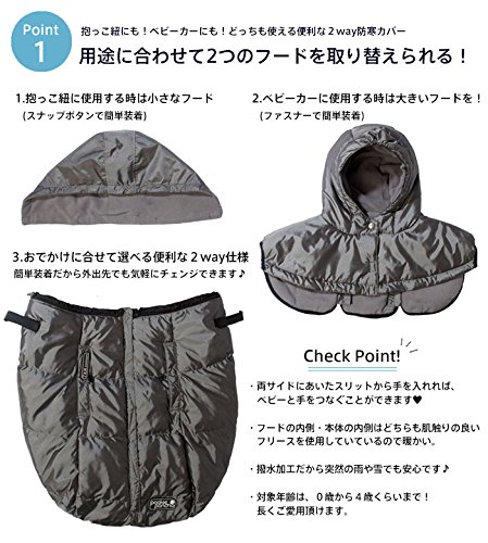 付属されている二つのフードを取り替えて、抱っこ紐やベビーカーで使用できる、2WAYの便利な防寒カバー