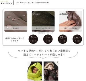 - 素材:表地/表地/ナイロン100%、裏地/ポリエステル100%、中綿/ポリエステル100%
