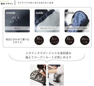 - 素材:表地/表地/ナイロン100%、裏地/ポリエステル100%、中綿/ポリエステル100%