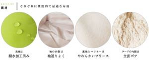 - 素材:表地/表地/ポリエステル100%、裏地/ポリエステル100%、中綿/ポリエステル100%
