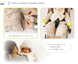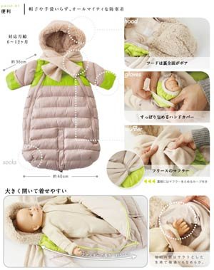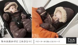 7A.M. ENFANT Doudoune は、ボリューミーなボア付きのフードと、フリースのマフラー、折り返すと手袋代わりの防寒が出来る袖口と、機能がいっぱい。こまごまとした冬小物の役割も、すべてこのスーツがこなしてくれます。大きく開くサイドの2つのファスナーで、着せやすく、お出かけの準備も簡単!荷物も心も軽く、ママとベビーのお出かけをサポートします。