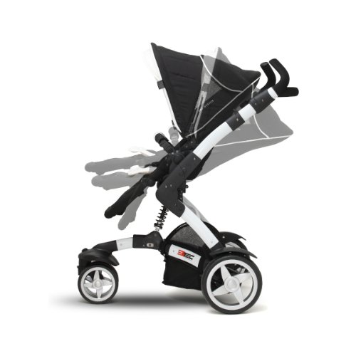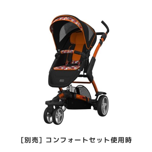 剛性の高い楕円形のアルミフレーム、オーバーフェンダー付きメンテナンスフリーの大型タイヤ、シート真下に配置されたコイルスプリング式サスペンション、すべてが最上の乗り心地と運転性能を実現するためのこだわりです。前輪は安定性の高いダブルタイヤを装備した、3輪ベビーカーです。小回りの利いたスムーズな運転性能が特徴です。