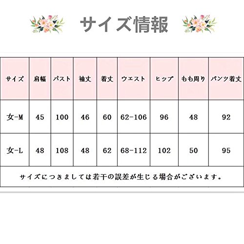 - 【サイズ】女性用サイズM→肩幅:45cm,バスト:100cm,袖丈:46cm,着丈:60cm,ウェスト:62-106cm,ヒップ:96cm,モモ幅:48cm,ズボン丈:92cm,体重:55kg以内;女性用サイズL→肩幅:48cm,バスト:108cm,袖丈:48cm,着丈:62cm,ウェスト:68-112cm,ヒップ:102cm,モモ幅:50cm,ズボン丈:95cm,体重:70kg以内